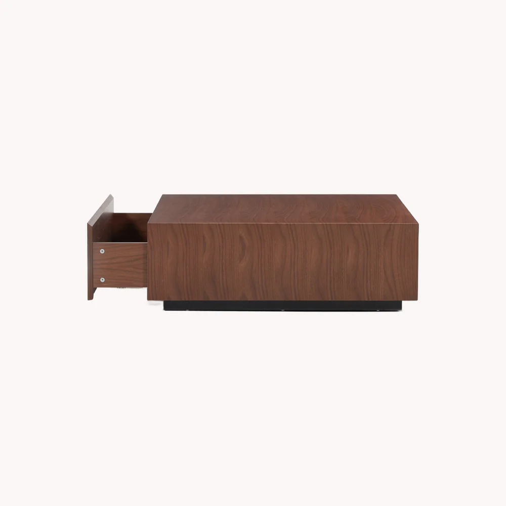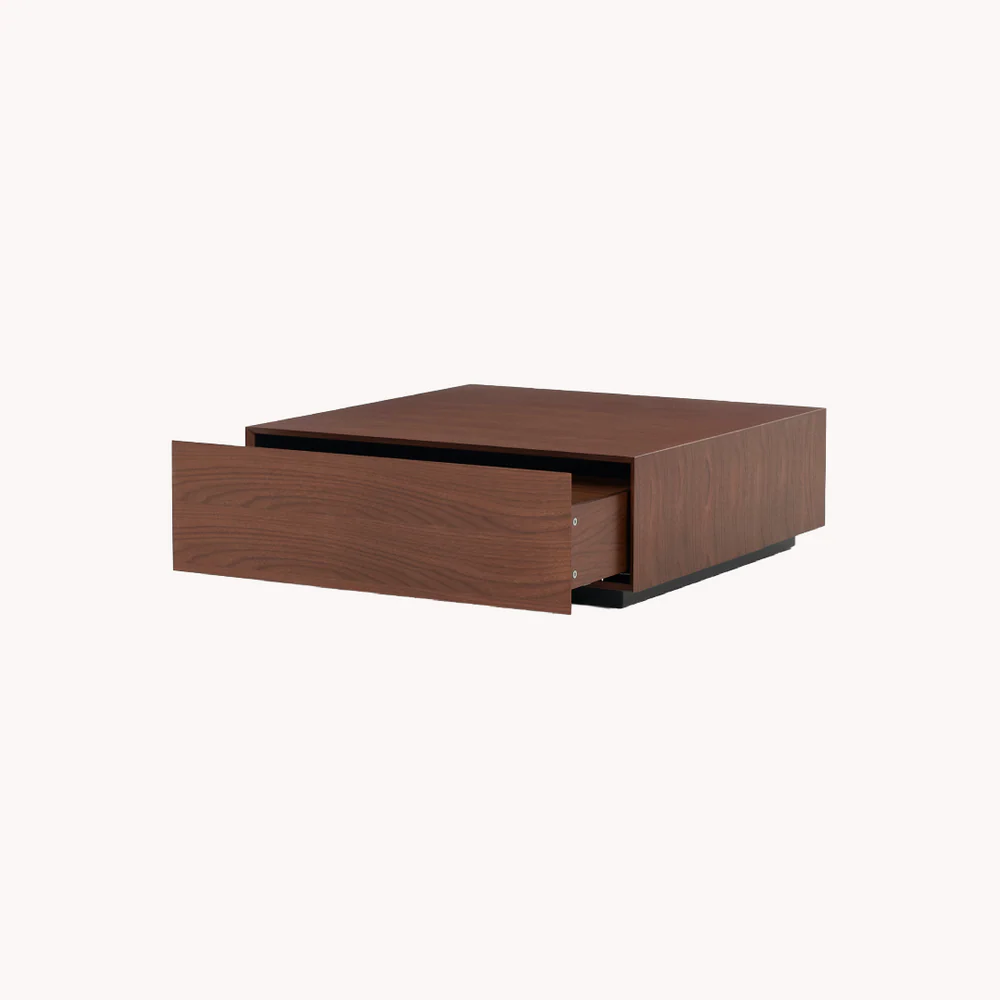 A sleek, low-profile coffee table with a rich wood finish, featuring a spacious push to open drawer for discreet storage. Its clean lines and modern design make it both functional and stylish for contemporary living spaces.