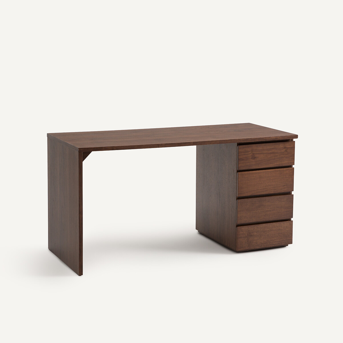 A sleek wooden desk featuring a minimalist design and clean lines. The right pedestal holds four handle-less drawers with recessed pulls for a seamless look, providing practical storage while maintaining an uncluttered aesthetic. Its spacious rectangular top offers ample workspace, making it ideal for both home offices and study areas.