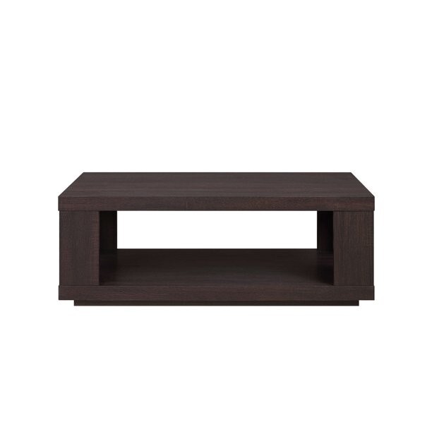 A wooden rectangular coffee table with a sturdy, geometric frame and open lower shelf. Its clean, solid construction makes it a versatile piece tor any space.
