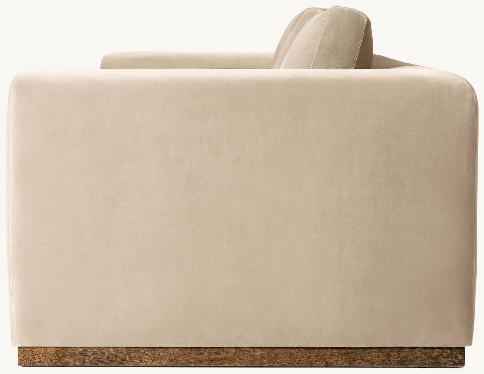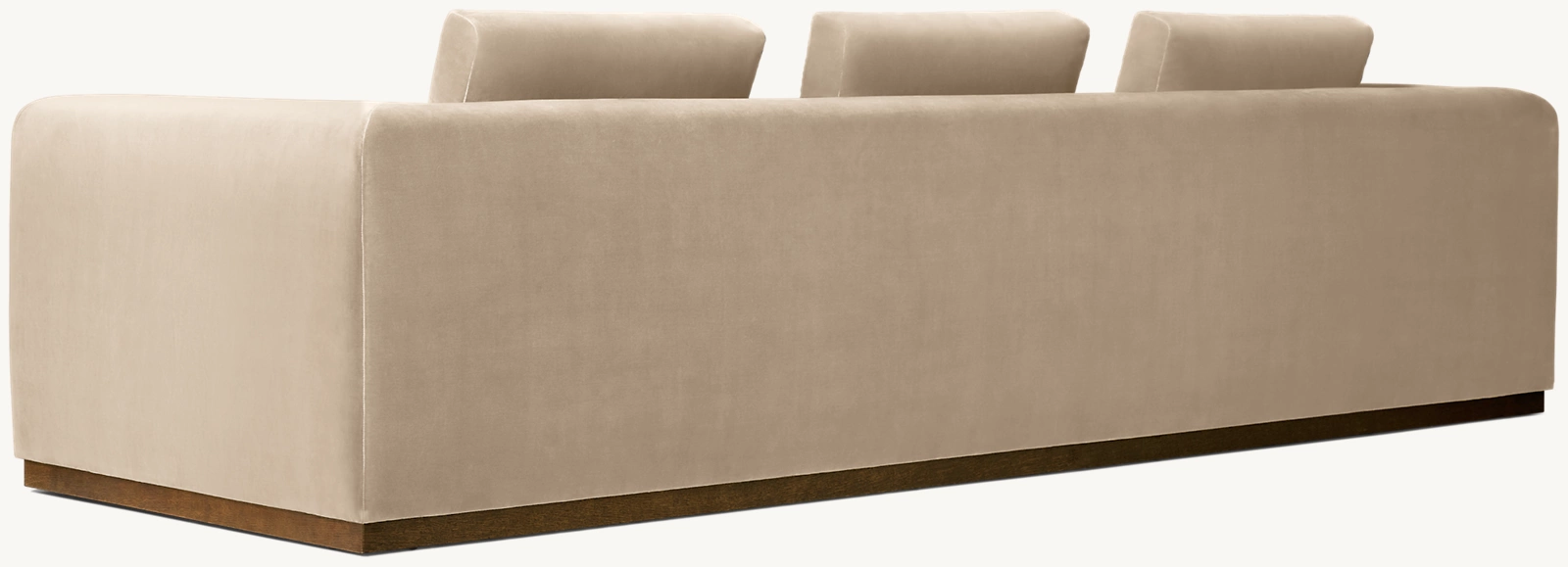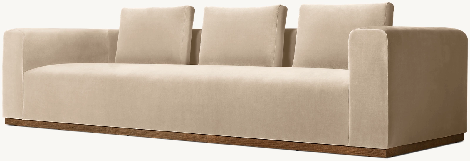 Minimalist in form and plush in feel, this sofa pairs clean, architectural lines with deep seating for ultimate comfort. Its boxy silhouette is softened by loose back cushions, while the wooden plinth base adds a warm, grounding detail. A timeless piece that blends effortlessly into any modern space.