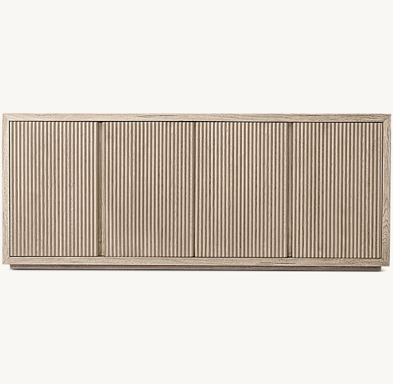 A modern wooden console with a striking slatted front design, framed by smooth edges. Its textured vertical lines add depth and visual interest, making it both a functional storage piece and a stylish statement for any space.