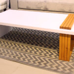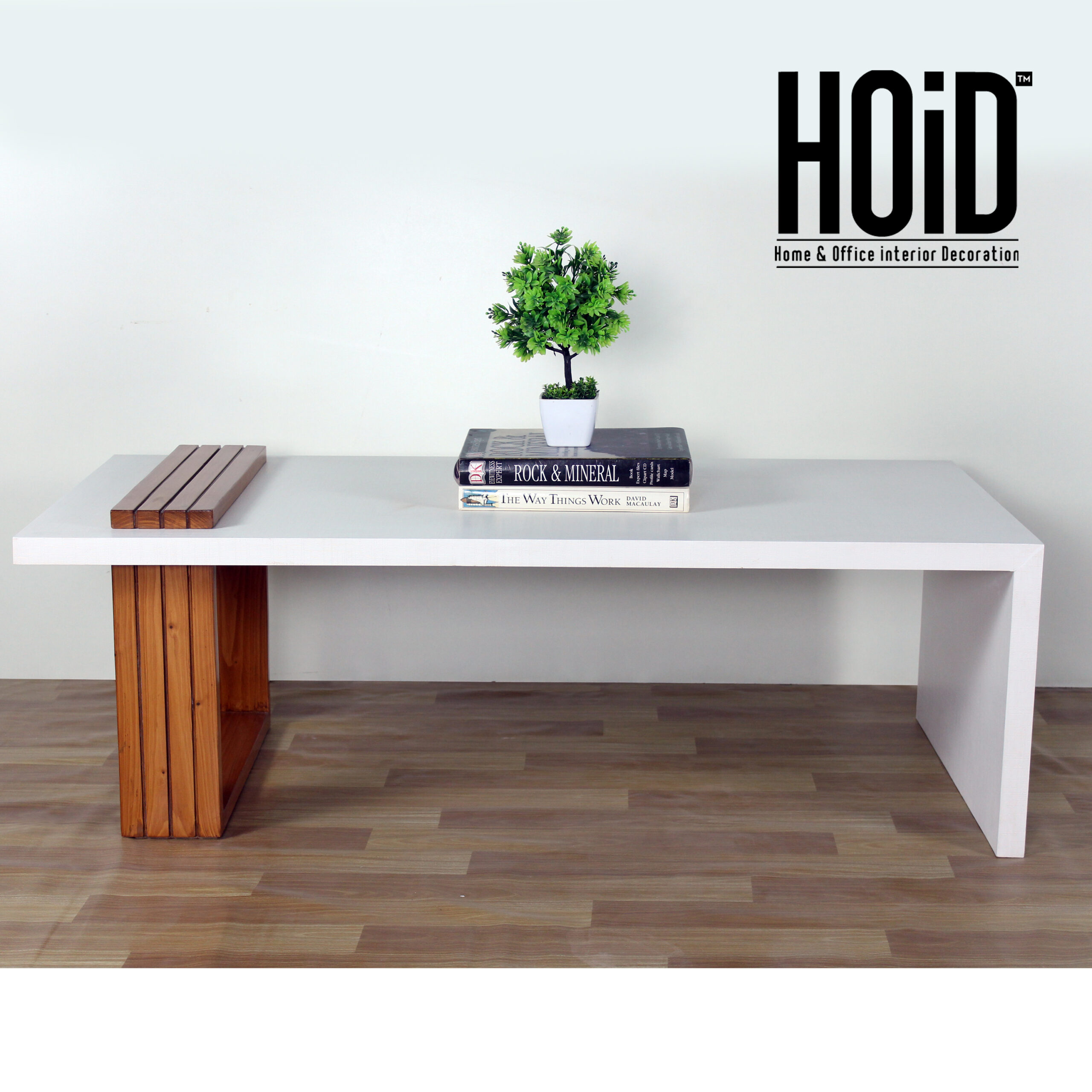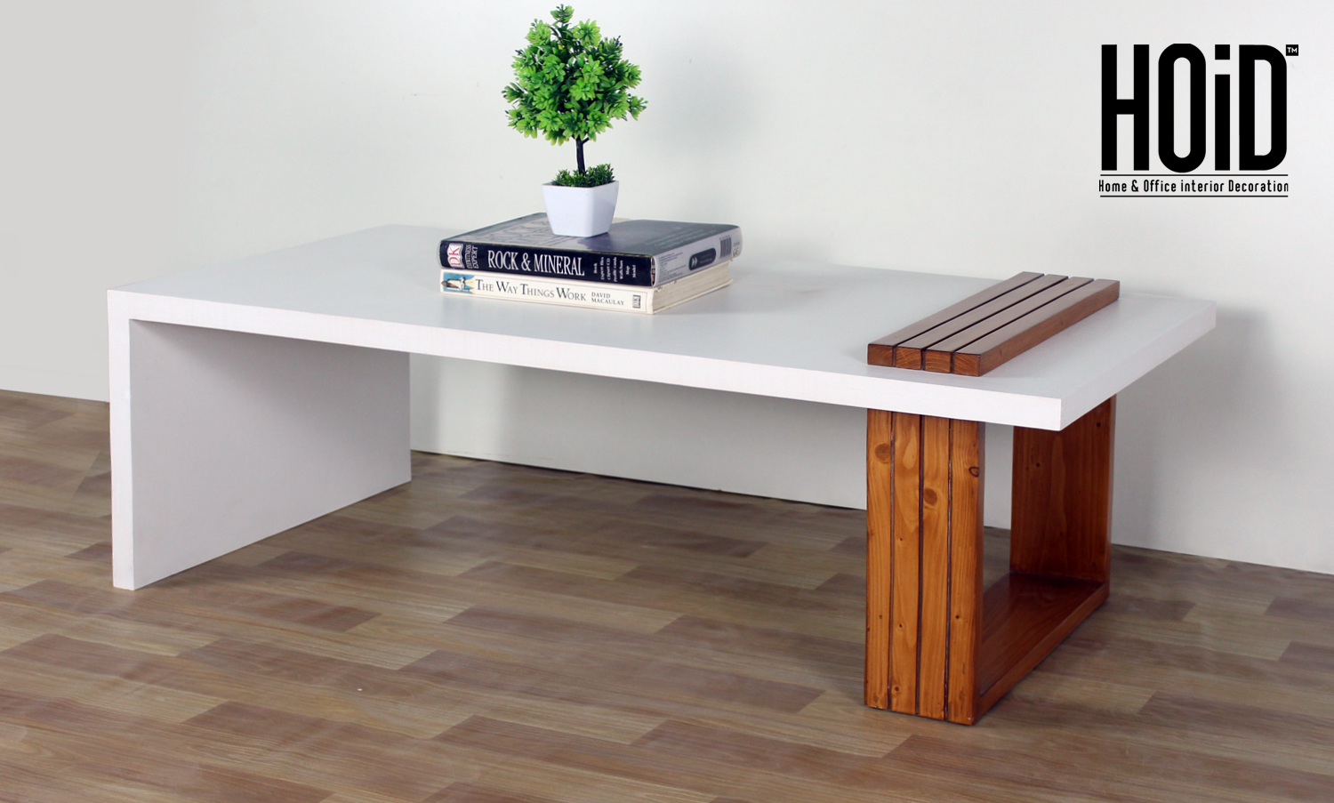 A modern rectangular coffee table with a sleek two-tone design. It features a clean white surface paired with a unique asymmetrical base—one side enclosed in white, the other an open-frame structure in wood for a striking contrast and contemporary flair.